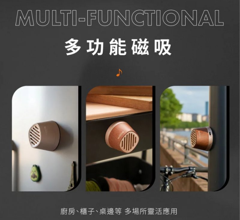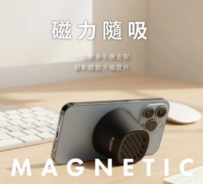 ・磁吸設計可吸附手機與金屬材質,兼具手機支架功能,馬上變身手機音響擴大機
